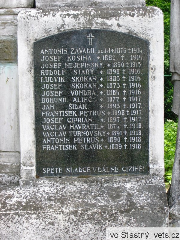 Antonín Zavadil učitel 1876-1914, Josef Kosina 1882-1914, Josef Nejepinský 1890-1915, Rudolf Starý 1898-1916, Ludvík Skokan 1883-1916, Josef Skokan 1873-1916, Josef Vondra 1884-1916, Bohumil Alinč 1877-1917, Jan Šidák 1893-1917, František Petrus 1898-1917, Josef Ciprián 1897-1917, Václav Navrátil 1874-1918, Václav Turnovský 1891-1918, Antonín Petrus 1890-1918, František Slavík 1889-1918