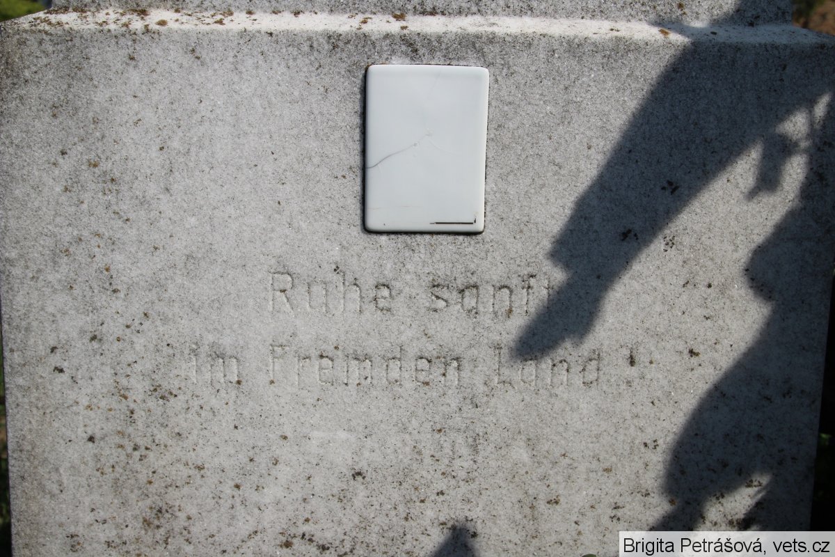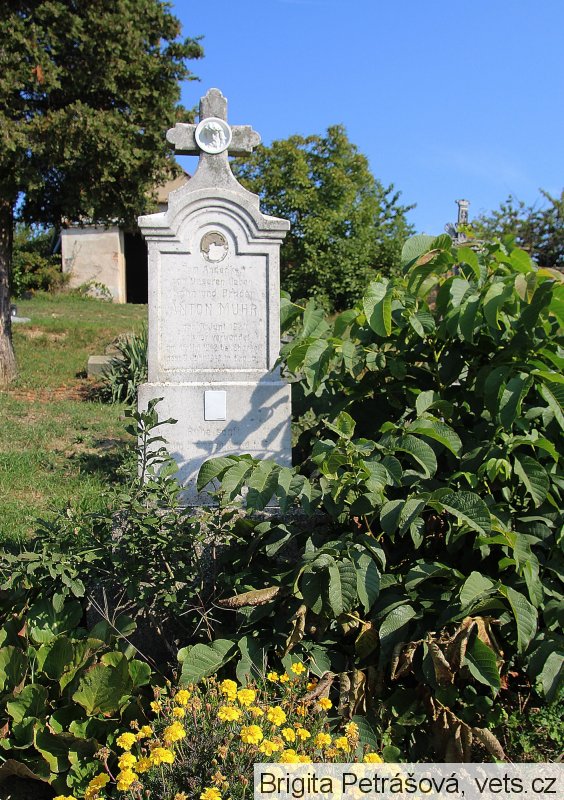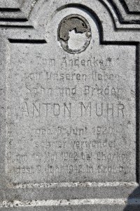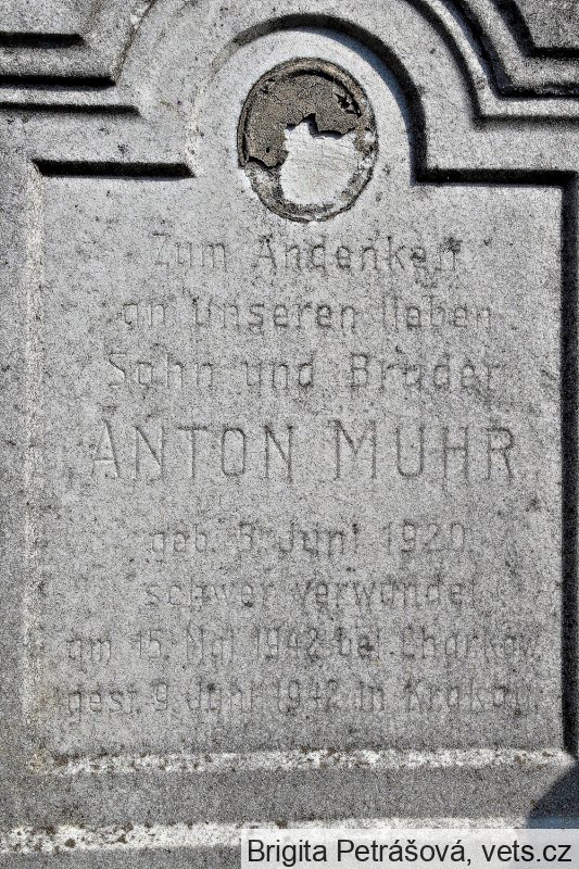Na památku našeho drahého syna a bratra Antona Muhra, nar. 5. června 1920, který byl těžce zraněn 15. května 1942 u Charkova a zemřel 9. června 1942 v Krakově.
