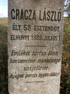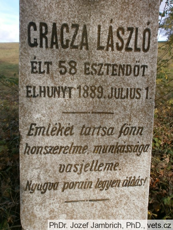 „László Gracza žil 58 rokov, zomrel 1. júla 1889. Pamätajte na jeho lásku k vlasti, pracovitosť a pevný charakter. Nech je požehnaný jeho odpočívajúci prach!“