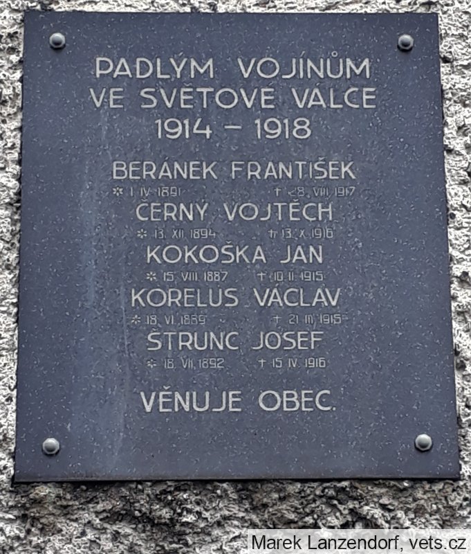 Václav Korellus, narozen Střapole, okr. Rokycany. Vojín, stř. pl. č. 7. Zemřel 23. 3. 1915 kóta 481, Karpaty, Uhry. Pohřben 23. 3. 1915 kóta 481, Karpaty, Uhry.