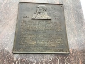 THE MASARYK MEMORIAL MONUMENT WAS CREATED BY ALBIN POLÁŠEK SCULPTOR, COMPLETED IN 1949 AND DEDICATED MAY 29, 1955. THIS MEMORIAL PLAQUE PRESENTED BY THE MASARYK MEMORIAL DEDICATION COMMITTEE.