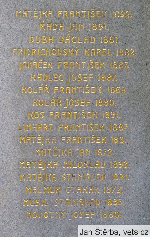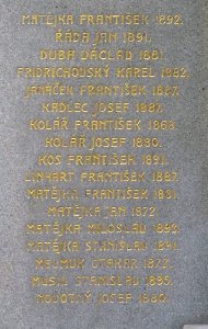 MATĚJKA FRANTIŠEK 1892., ŘÁDA JAN 1891., DUBA VÁCLAV 1881., FRIDRICHOVSKÝ KAREL 1882., JANÁČEK FRANTIŠEK 1887., KADLEC JOSEF 1887., KOLÁŘ FRANTIŠEK 1869., KOLÁŘ JOSEF 1880., KOS FRANTIŠEK 1891., LINHART FRANTIŠEK 1887., MATĚJKA FRANTIŠEK 1881., MATĚJKA JAN 1972., MATĚJKA MILOSLAV 1893., MATĚJKA STANISLAV 1891., MELMUK OTAKAR 1871., MUSIL STANISLAV 1895., NOVOTNÝ JOSEF 1880.