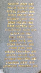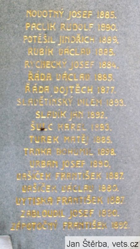 NOVOTNÝ JOSEF 1885., PACLÍK RUDOLF 1890., POTĚŠIL JINDŘICH 1889., RUBÍK VÁCLAV 1885., RYCHECKÝ JOSEF 1884., ŘÁDA VÁCLAV 1885., ŘÁDA VOJTĚCH 1877., SLAVĚTÍNSKÝ VILÉM 1893., SLADÍK JAN 1892., ŠULC KAREL 1893., TUREK MATĚJ 1885., TRNKA BOHUMIL 1898., URBAN JOSEF 1890., VAŠÍČEK FRANTIŠEK 1887., VAŠÍČEK VÁCLAV 1880., VYTISKA FRANTIŠEK 1887., ZABLOUDIL JOSEF 1890., ZÁPOTOČNÝ FRANTIŠEK 1892.