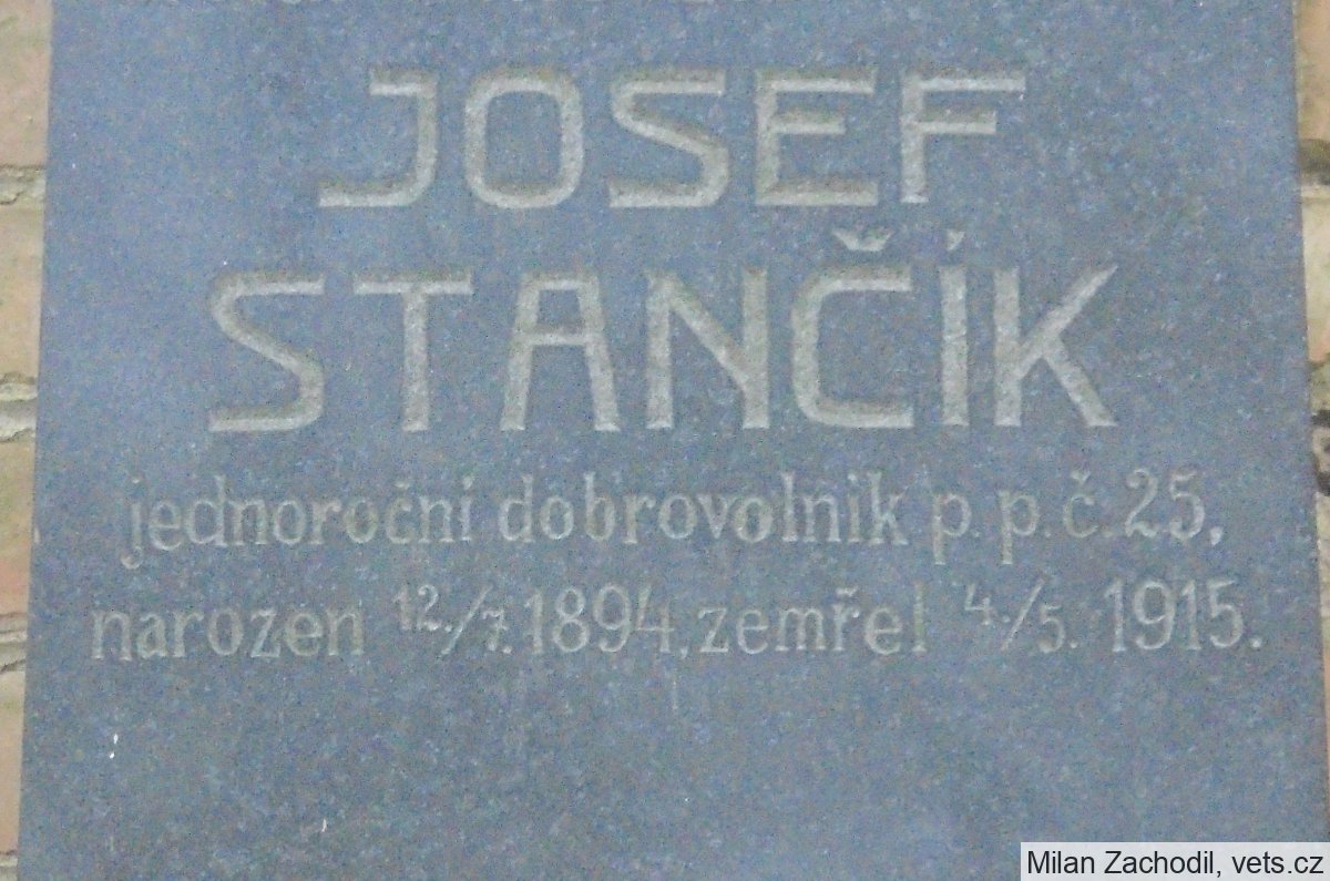 Josef Stančík zemřel na tbc v Militärbeobachtungsspital Göding (Hodonín) a zde také pohřben, odd. IX, hrob č. 46.