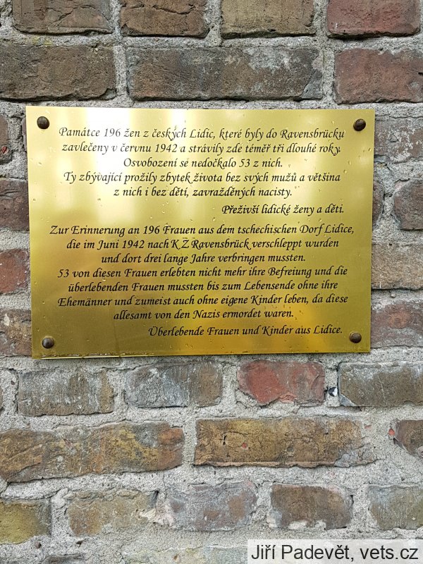 Umístění: Ravensbrück, Strasse der Nationen, vzpomínková zeď na jih od krematoriaPamátce 196 žen z čekých Lidic, které byly do Ravensbrücku