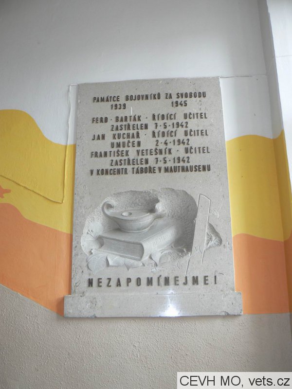 BUBENÍK ALOIS 2.3.1943 BRUEGG, BOKŮVKA ZDENĚK 15.8.1941 BRESLAU, BĚLKA JAN 27.11.1942 OSWIECZYM, BRADÁČ JAN 31.7.1942 ARNSDORF, ČECH FRANTIŠEK 18.8.1944 BRUEGG, DOSTÁL JOSEF 20.3.1945 FLOSSENBURG, HRUBAN BOHUSLAV 1.5.1945 DACHAU, KREJČÍŘ ANTONÍN 13.3.1942 OSWIECZYM, KOMÍNEK ANTONÍN 24.8.1944 BUCHENVALD, KOMENDA ANTONÍN 1.3.1941 OSWIECZYM, KARHÁNEK FRANTIŠEK 1943 OSWIECZYM, KUČERA RUDOLF 31.10.1945 ANDLARKA, LAKOMÝ JOSEF 3.7.1942 BRESLAU, MYŠÁK JAN 6.4.1945 BUCHENVALD, PIKOVSKÝ FRANTIŠEK 13.8.1942 OSWIECZYM, PEŠL JOSEF 26.8.1943 MÍROV, PŘIKRYL FRANTIŠEK 22.5.1945 AMBERG, PISKOVSKÝ OLDŘICH 3.3.1942 OSWIECZYM, RÁBEK RUDOLF 1.4.1942 MAUTHAUSEN, SYNEK JOSEF 18.4.1943 OSWIECZYM, ŠPIČÁK JIŘÍ 22.2.1945 VALDHEIM, ŠVANCARA OLDŘICH 23.4.1943 OSWIECZYM, ŠMÍD FRANTIŠEK 24.10.1944 BRNO, VYROUBAL FRANTIŠEK 132.10.1942 BRUEGG, VYSKOČIL JOSEF 22.3.1943 OSWIECZYM, VYSKOČIL FERDINAND 17.1.1943 OSWIECZYM, ZBOŘIL BEDŘICH 28.1.1943 OSWIECZYM, ZATLOUKAL RICHARD 31.1.1943 OSWIECZYM, ZAČAL JAN 6.2.1942 MAUTHAUSEN