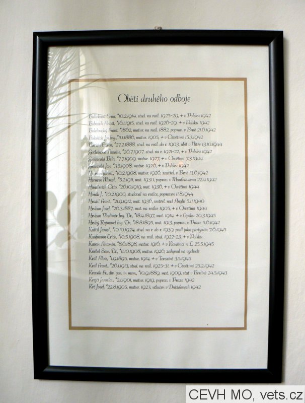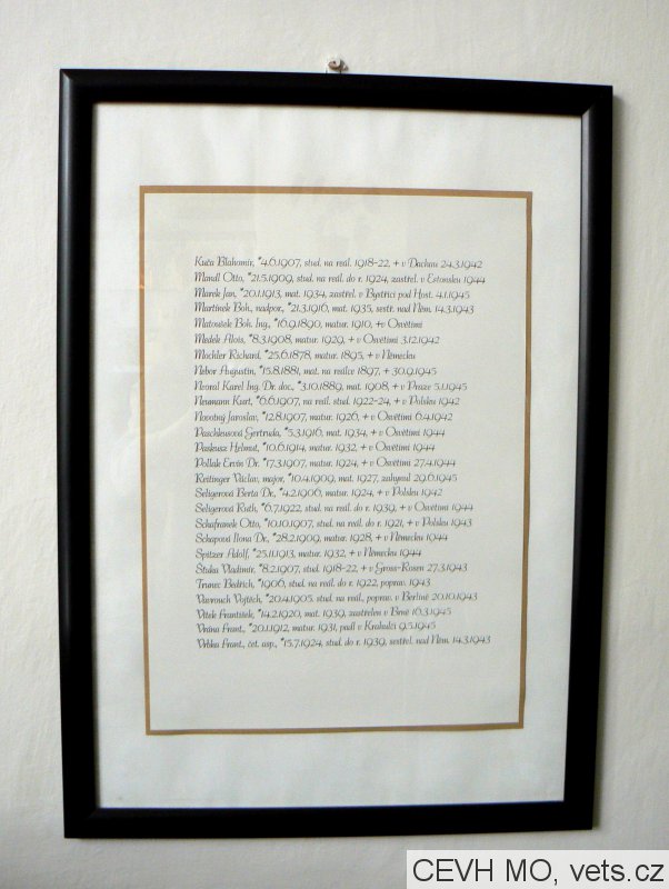 BAJZA ANTONÍN 21.5.1944 BRESLAU, ING. BRAMMER PAVEL 28.2.1941 DACHAU, DREXLER ALOIS 2.3.1943 OLOMOUC, GOTTLEINOVÁ AMÁLIE 1942 MAJDANKY, HALENKA ANDĚLÍN 26.11.1943 BERLÍN, HOOR BEDŘICH 7.3.1944 OSWIECZYM, JEŘÁBEK JAN 1.6.1945 PROSTĚJOV, JISKRA JOSEF 18.9.1944 BRESLAU, KARŠULIN JOSEF 6.10.1942 OSWIECZIM, KONŠTÁNSKÝ JAN 18.10.1944 DRÁŽĎANY, KOZIČKA VILÉM 30.6.1945 PROSTĚJOV, KLECL JOSEF 22.3.1940 BRNO, KVAPIL KAREL 18.1.1943 BRUEGGG, KLEIN LEOPOLD 26.8.1943 OSWIECZYM, MLČOCH FLORIÁN 31.12.1943 BUCHENWALD, MALÍK BEDŘICH 17.3.1944 BRNO, NĚMEC LEO 17.12.1942 MAUTHAUSEN, NOVÁČEK KAREL 26.5.1945 PROSTĚJOV, NOVOTNÝ BEDŘICH 4.1.1945 BISINGEN, PACOLA KAREL 11.3.1944 BRUEGG, PATKA JAN 28.12.1942 OSWIECZYM, POSPÍŠIL OLDŘICH 20.11.1943 BRUEGG, PRŮŠA JOSEF 25.6.1942 MAUTHAUSEN, POLÁK ALFRED 7.3.1944 OSWIECZYM, POLÁK MOŘIC 7.3.1944 OSWIECZYM, POLÁK MAX. 7.3.1944 OSWIECZYM, ROSENBERG BEDŘICH 1942 MAJDANKY, STEIGLER BEDŘICH 5.5.1944 BRESLAU, JUC. STEINER ROSTISLAV 27.4.1946 PROSTĚJOV, SOMMER PAVEL 12.4.1946 PROSTĚJOV, ŠIMEČEK JAROSLAV 30.4.1944 BRUEGGG, VINKLER JOSEF 22.1.1942 OSWIECZYM, VYMAZAL KAREL 2.3.1943 BRUEGG