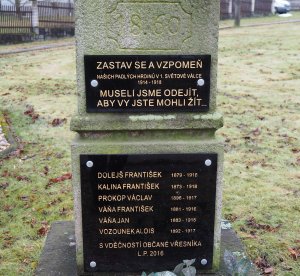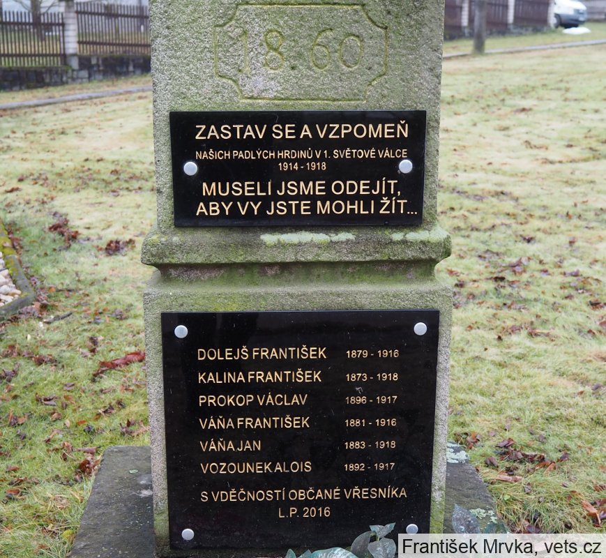 Václav Prokop, nar. 1896 Vřesník, padl 17.2.1917 u Wadut-Roscai-Indet, Putna, Rumunsko, pohřben ve Wadul-Boscai na místním hřbitově.
