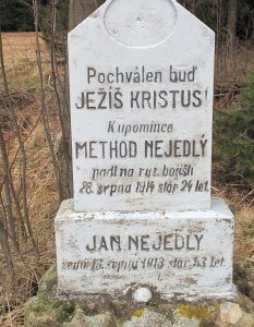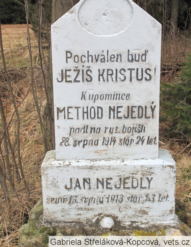 Svobodník, čestný desátník Metoděk Nejedlý, nar. 1890, Zašovice – Nová Brtnice, okres Třebíč, Morava, příslušník zeměbraneckého pěšího pluku 14. Padl v r. 1914 na ruském bojišti (místo neudáno). Hrob neuveden, pohřben na bojišti.