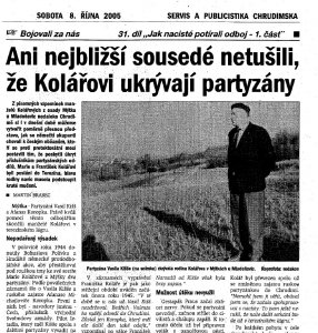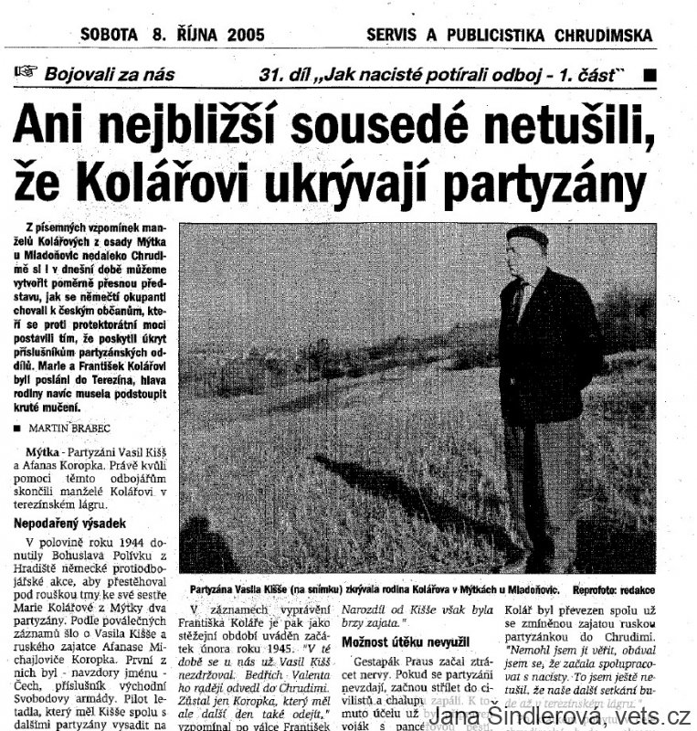 Marie a František Kolářovi z Mýtek za pomoc a poskytnutí úkrytu příslušníkům partyzánského oddílu skončili v únoru 1945 v terezínském lágru. Jednalo se o partyzána Vasila Kiše, pozdějšího velitele partyzánského pluku Ludvíka Svobody na Chrudimsku a ruského zajatce Afanase Michajloviče Koropka, bývalého kozáka z Kubáně u Rostova. Ten se po útěku ze zajateckého tábora v Mostě ještě se dvěma dalšími vězni nejprve rok ukrýval v hájence Josefa Eise na okraji Křemenice. Po prozrazení byl hajný i s manželkou uvězněn. Josef Eis byl ubit k smrti v Terezíně dne 30.3.1945. Partyzán Kiš a zajatec Koropko se nějaký čas skrývali ještě u Bohuslava Polívky v Hradišti. Kvůli německým protiodbojovým akcím byl však donucen je v polovině roku 1944 přestěhovat právě ke své sestře, Marii Kolářové na Mýtka. Zde si ve stodole vykopali bungr, kde se přes den ukrývali. Došlo však k prozrazení a začátkem února 1945 k obsazení osady Mýtka německými vojáky. Po zatčení byli všichni nejprve odvezeni do pardubického vězení, kde byl František Kolář krutě mučen. Dne 14.4.1945 došlo k transportu do Malé pevnosti Terezín do cel smrti. Uvězněna byla manželka Marie, jejich dcery Marie a Milada, i její bratr Bohuslav Polívka z Hradiště. Zatčení unikl jen syn František, který ležel se záškrtem v chrudimské nemocnici. Naštěstí se blížil konec války. Přežili, i když se v koncentračním táboře nakazili skvrnitým tyfem. Pan František Kolář se z nemocnice vrátil dokonce až v červenci 1945. Jejich dům byl vykradený, ale stál.