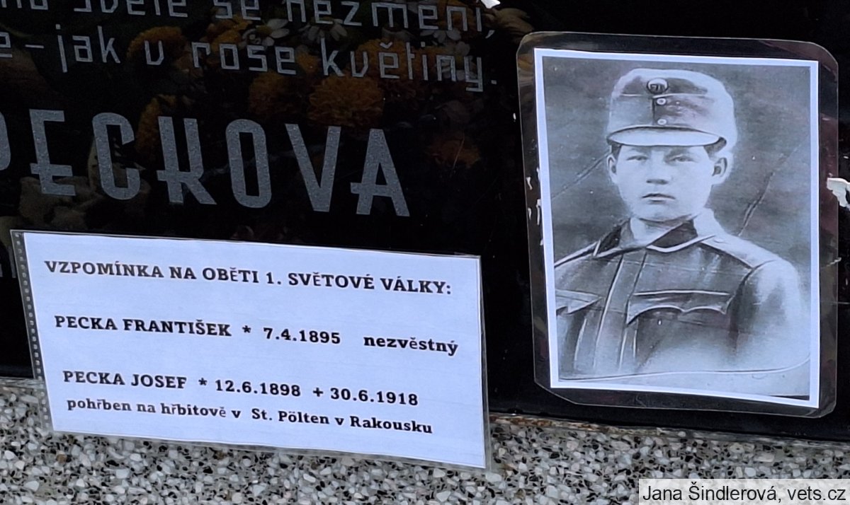 Josef Pecka, nar.1898, příslušnost k R-U útvaru: 12. střelecký pluk, zemřel na střelná poranění v záložní nemocnici v Sankt Pölten, Dolní Rakousy. Je pohřben ve vojenské části městského hřbitova, oddělení V., řada 2, hrob č. 109.