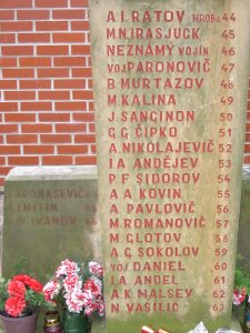 Alexej Ivanovič Ratov 1919 5.7.1945 X/44 SSSR, Michael Nikolajevič Irasjok 7.7.1945 X/45 SSSR, neznámé vojín 25.6.1945 X/46 SSSR, Paranovič 18.6.1945 X/47 SSSR, Boris Murtazov 1921 8.6.1945 X/48 SSSR, Nikolajevič Kalina 11.5.1945 X/49 SSSR, Josef Šangiren 13.5.1945 X/50 SSSR, Grigorij Grigorič Čipka 11.5.1945 X/51 SSSR, Alexej Nikolajevič Ardějov 11.5.1945 X/52 SSSR, Ivan Alexejevič seržant 1910 14.5.1945 X/53 SSSR, Petr Fjodorovič Sidorov staršina 1915 14.5.1945 X/54 SSSR, Alexandr Alexandrovič Kovin seržant 1902 14.5.1945 X/55 SSSR, Alexandr Pavlovič staršina 1900 14.5.1945 X/56 SSSR, Michal Romanovič seržant 1903 14.5.1945 X/57 SSSR, Hotov Martojan Trolinovič vojín 1904 14.5.1945 X/58 SSSR (jméno uvedeno podle záznamů městské nemocnice; Hotov Trofinovič Martojan dle pohřebních knih), Georgij Alexej Sokolov staršina 11.51945 X/59 SSSR, Daniel Fjodorovič Ščukin 9.8.1945 X/60 SSSR, Ivan Andrejevič Andel staršina 1900 14.5.1945 X/61 SSSR, Alexej Kirilovič Malsef 1902 14.5.1945 X/62 SSSR, Vasílič Nikolajev staršina 1902 14.5.1945 X/63 SSSR, Ivan Jevrej Aronesevič staršina 1904 14.5.1945 X/64 SSSR, Andrej Ivanovič Mutin 1898 15.5.1945 X/65 SSSR, Vasil Vasiljevič Ivanov 11.5.1945 X/66 SSSR, Pavel Michajlovič 1913 24.5.1945 X/67 SSSR, Utrovin 2.6.1945 X/68 SSSR, Jakub Jachanovič Kozub 4.6.1945 X/69 SSSR