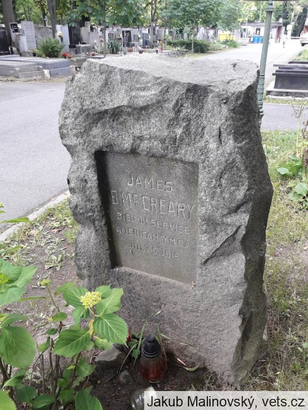 James B. McCreary z USA byl stár 23let, a za 1. světové války sloužil jako vzduchoplavec a kinooperatér. Po válce byl sekretářem (tajemníkem) americké vojenské mise v Praze, a vedoucím filmového oddělení YMCA. Pohřben byl 7.7.1919 na Olšanských hřbitovech, a dle informací správy hřbitova leží v hrobě číslo 1, v oddělení 6, na hřbitově 2ob. Jeho hrob je na rohu cest.