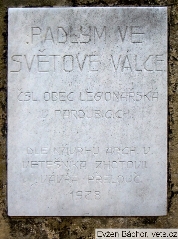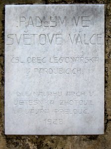 Památník kruhového půdorysu, v jehož středu je obruba se čtyřmi hranoly a centrální břízou. Vnější kruh tvoří osm vyšších hranolů s nápisy připomínající bitvy 1. a 2. sv. války. Památník je z pískovce. Jednotlivé pylony jsou označeny bronzovými nápisy: TOBRUK, ZBOROV, KOTOR, SOKOLOVO, DUKLA, DOSS ALTO, DUNKERQUE, VOUZIERS. Na boční straně pylonu DUKLA je osazena mramorová deska s textem: "Padlým ve světové válce čsl. obec legionářská v Pardubicích. Dle návrhu arch. V. Vetešníka zhotovil J. Vávra Přelouč. 1928".