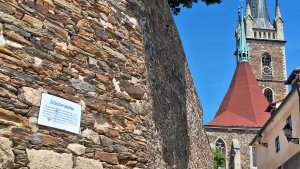 Umístění: Čáslav, Žižkova brána, zeď původních hradeb opevnění Starého Města, po schodech vstup na Kostelní náměstíNápis: