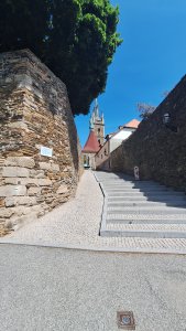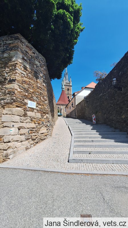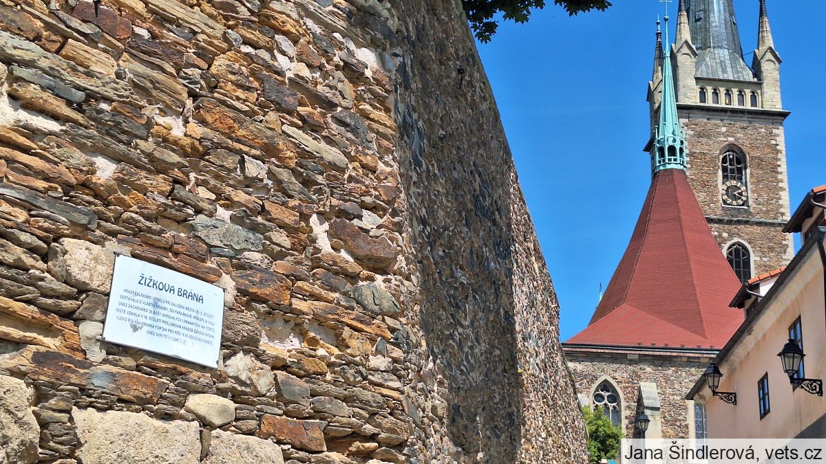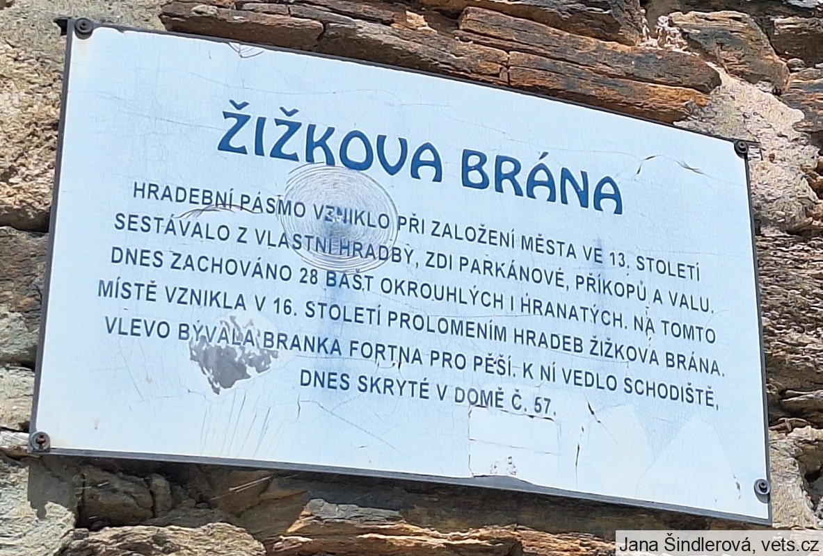 HRADEBNÍ PÁSMO VZNIKLO PŘI ZALOŽENÍ MĚSTA VE 13. STOLETÍ. SESTÁVALO Z VLASTNÍ HRADBY, ZDI PARKÁNOVÉ, PŘÍKOPŮ A VALU. DNES ZACHOVÁNO 28 BAŠT OKROUHLÍCH I HRANATÝCH. NA TOMTO MÍSTĚ VZNIKLA V 16. STOLETÍ PROLOMENÍM HRADEB ŽIŽKOVA BRÁNA. VLEVO BÝVALA BRANKA FORTNA PRO PĚŠÍ. K NÍ VEDLO SCHODIŠTĚ, DNES SKRYTÉ V DOMĚ Č. 57.